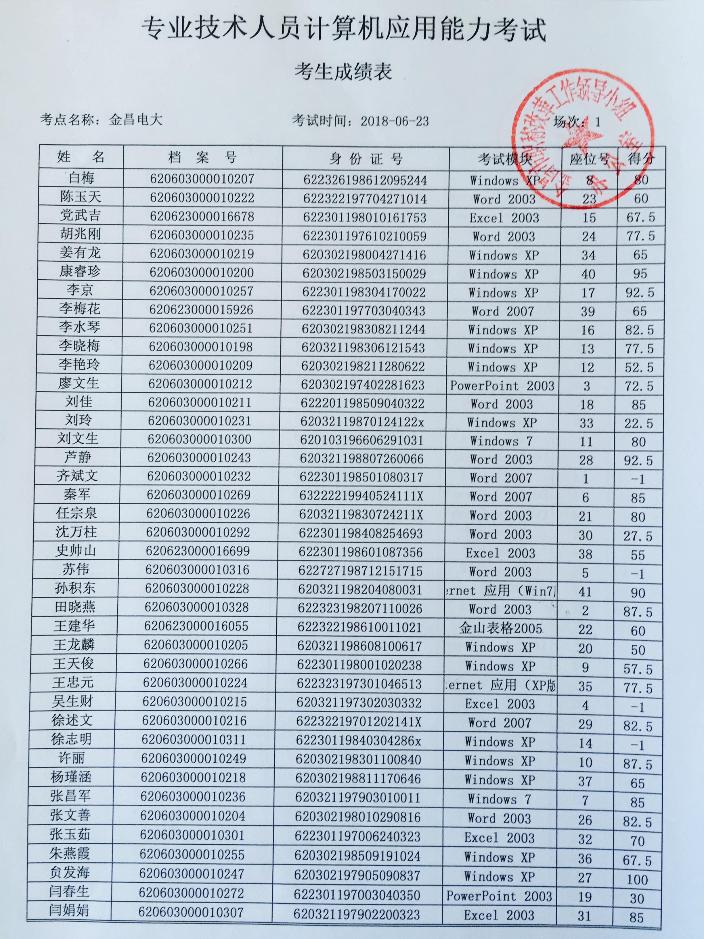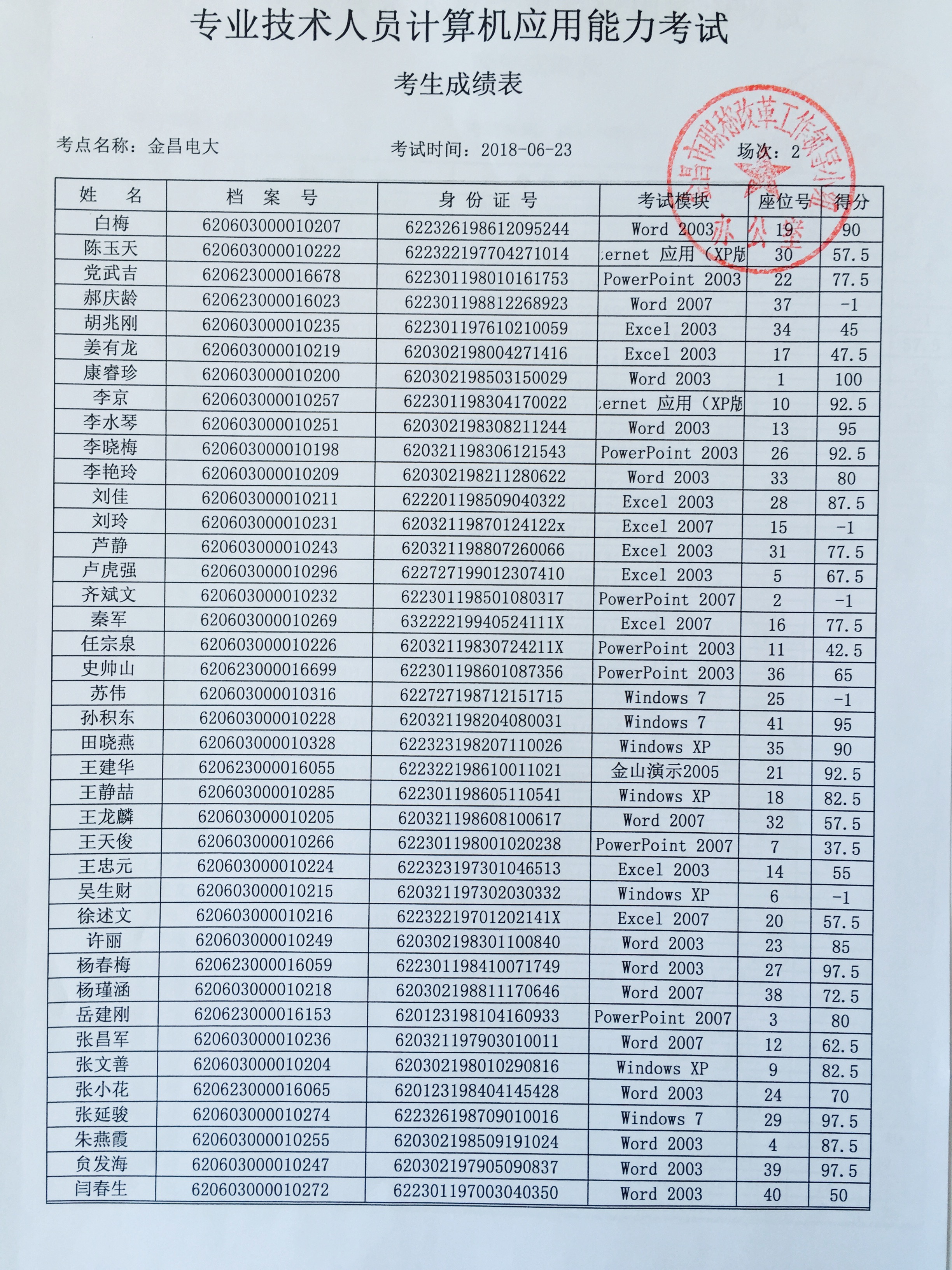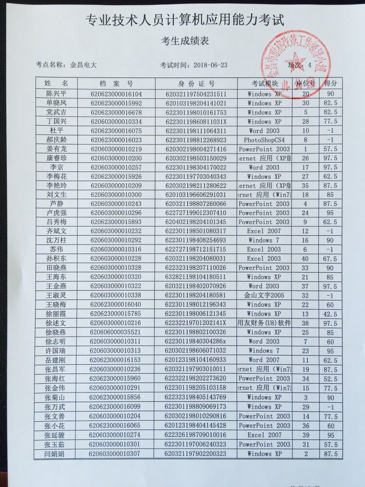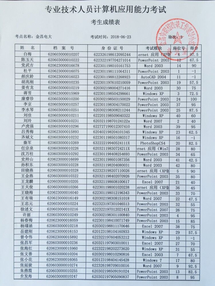金昌市2018年计算机应用能力考试(第一期)已于2018年6月23日组织完成,现将考试成绩予以公布,请考生查阅。